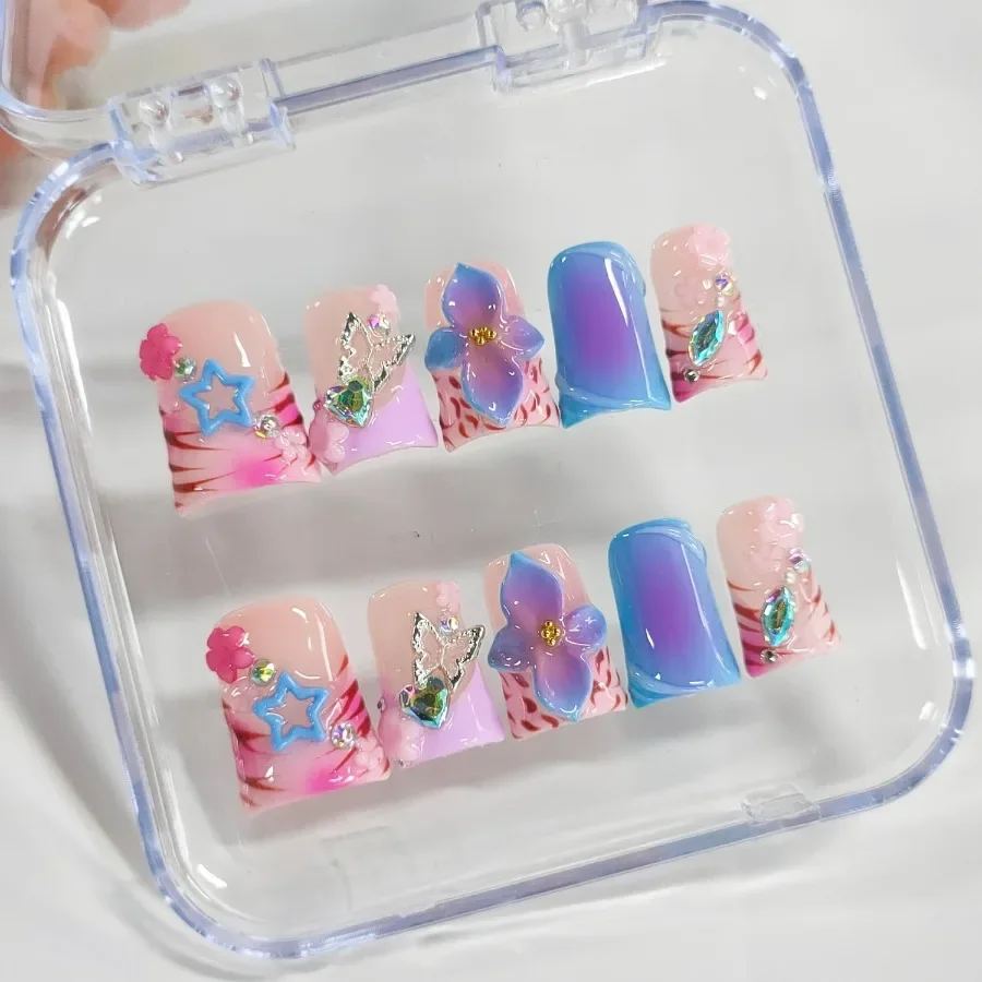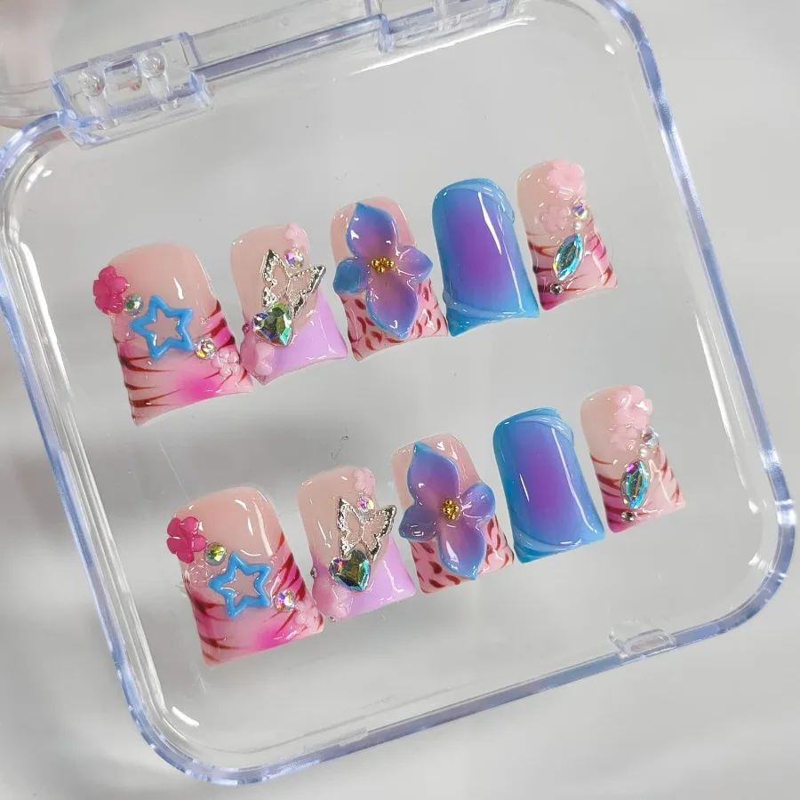 These Pastel press on nails feature soft pink, purple, and blue tones with cute 3D butterflies, flowers, and star accents. Designed with a glossy jelly finish, this set delivers a playful soft girl aesthetic perfect for everyday wear, casual outings, and creative styling.